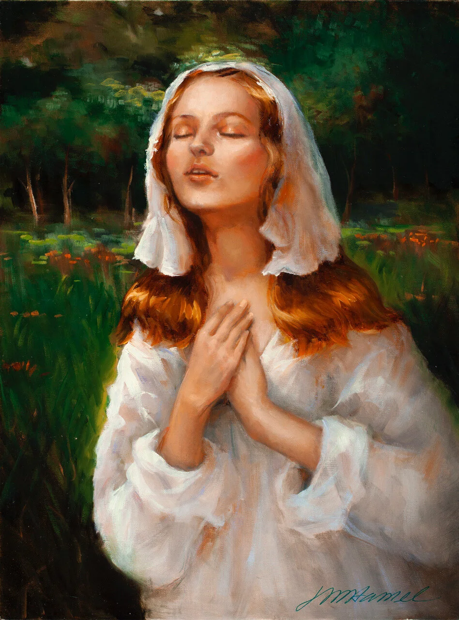 “Joan of Arc - The Calling” is my interpretation of Joan of Arc when she begins hearing the voice of God and is unwavering in her following. I’ve tried to capture her purity in her morning garden as she prays with devotion and lovingly receives her inner calling.